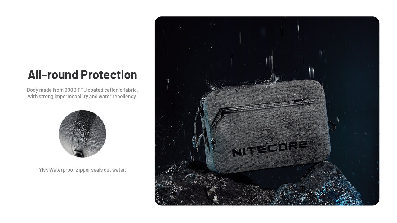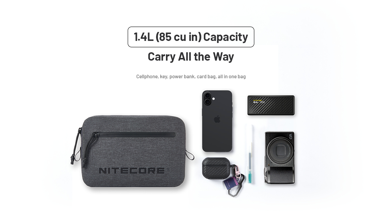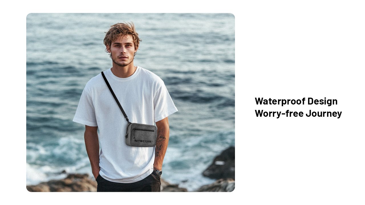 The Nitecore NPP02 is a compact, water-resistant crossbody pouch designed for everyday carry and outdoor use. Measuring 19 cm × 5.5 cm × 13 cm with a 1.4 litre capacity and weighing approximately 140 g, it’s made from durable 900D TPU-coated cationic fabric with YKK waterproof zippers. It features a main compartment with an internal mesh pocket, a front zippered pocket for quick-access items, and multiple attachment points including side D-rings. The adjustable strap allows it to be worn crossbody or as a chest pouch, making it ideal for securely carrying essentials like phones, wallets, and cables in a sleek, urban-friendly design.